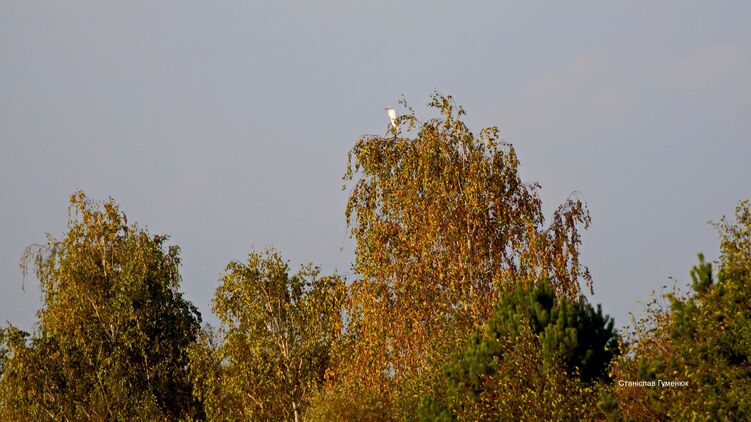 На снимке можно увидеть белую цаплю, которая сидит на самой верхушке березы на фоне неба в Чернобыльском заповеднике.