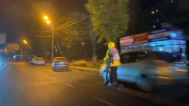 Примечательно, что на снимке изображена женщина без шлема, которая поставила за руль ребенка постарше, а в рюкзаке на спине везет младенца. Все действо происходит на высокой, как для самоката, скорости, по дороге и вдоль припаркованных машин в темное время суток.