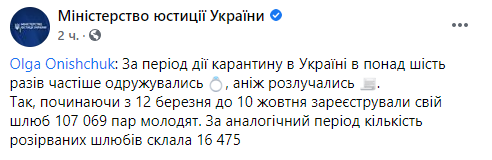 В период коронавирусного карантина в Украине зарегистрировали в шесть раз больше браков, чем разводов. Об этом сообщается на странице Министерства юстиции Украины в соцсети.