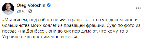"Мы живем, под собою не чуя страны..." - это суть деятельности большинства моих коллег из правящей фракции. Судя по фото из поезда "на Донбасс", они до сих пор думают, что кому-то в Украине не хватает именно веселья", - прокомментировал поездку депутат Олег Волошин.