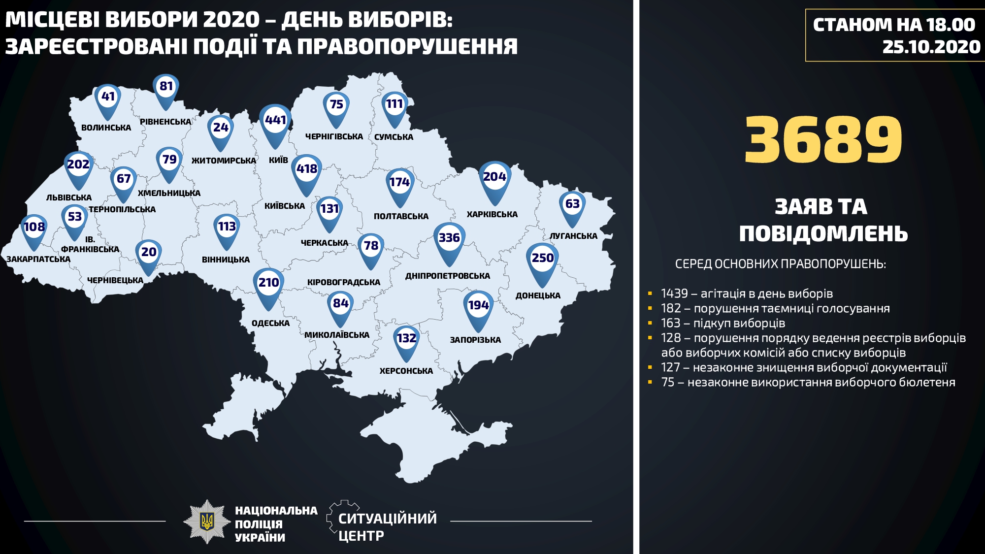 18:47 Полиция опубликовала карту нарушений на 18:00. Лидируют Киев и область, затем идут Днепропетровская, Донецкая и Львовская области.