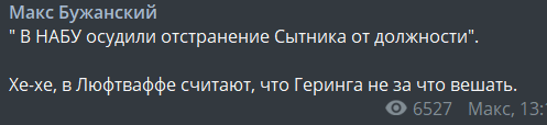 "В НАБУ осудили отстранение Сытника от должности". Хе-хе, в Люфтваффе считают, что Геринга не за что вешать", - пишет он.
