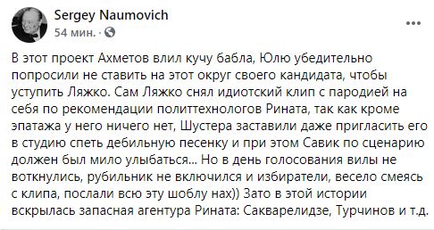 "В этот проект Ахметов влил кучу бабла, Юлю убедительно попросили не ставить на этот округ своего кандидата, чтобы уступить Ляшко. Сам Ляшко снял идиотский клип с пародией на себя по рекомендации политтехнологов Рината, так как кроме эпатажа у него ничего нет, Шустера заставили даже пригласить его в студию спеть дебильную песенку и при этом Савик по сценарию должен был мило улыбаться... Но в день голосования вилы не воткнулись, рубильник не включился и избиратели, весело смеясь с клипа, послали всю эту шоблу нах)) Зато в этой истории вскрылась запасная агентура Рината: Сакварелидзе, Турчинов и т.д", - написал блогер Сергей Наумович.