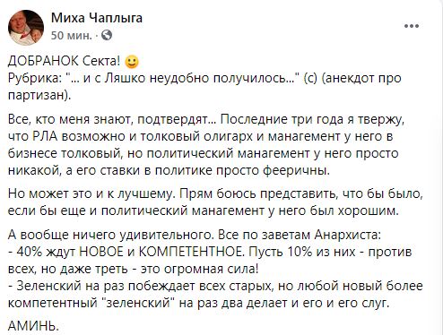 "Последние три года я твержу, что РЛА (Ахметов - Ред.), возможно, и толковый олигарх и манагемент у него в бизнесе толковый, но политический манагемент у него просто никакой, а его ставки в политике просто фееричны. Но, может, это и к лучшему. Прям боюсь представить, что бы было, если бы еще и политический манагемент у него был хорошим", - написал политический эксперт Михаил Чаплыга.