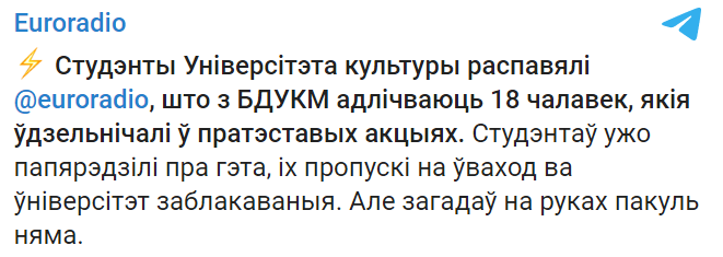 В среду, 28 октября, из Белорусского государственного университета культуры и искусства отчислили 18 человек, которые приняли участие в митингах, которые проходят в Минске.