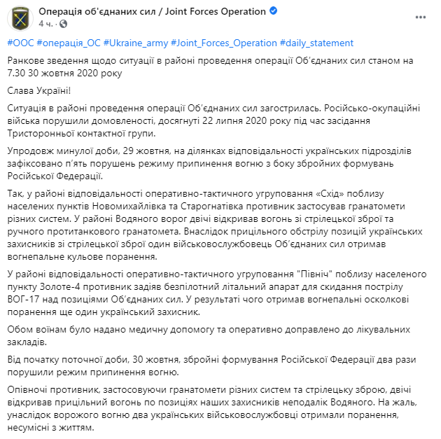 29 октября огнестрельное ранение получил боец на позициях у Водяного под Мариуполем. В тот же день у Золотого-4 беспилотник сбросил гранату на позиции ВСУ - один из бойцов получил осколочное ранение. Оба доставлены в больницу.