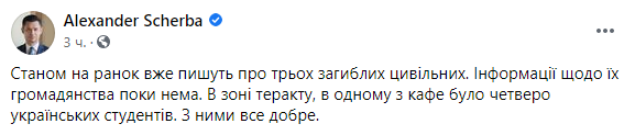 Так, "по состоянию на утро уже пишут о трех погибших гражданских. Информации об их гражданстве пока нет. В зоне теракта, в одном из кафе, было четверо украинских студентов. С ними все хорошо", - написал на своей странице в соцсети Щерба.