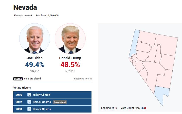 В Неваде (6 выборщиков), которая считается исконно за демократами, продолжает лидировать Байден - 49,3% против 48,7% у Трампа. Обработано 75% голосов.