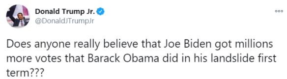 "Наблюдателей не допустили в комнаты для подсчета голосов. Я выиграл выборы, набрал 71 миллион законных голосов. Случилось много плохих вещей, которые нашим наблюдателям не позволили увидеть. Такого раньше не было. Никола не было. Миллионы почтовых бюллетеней разослали людям, которые о них никогда не просили!"