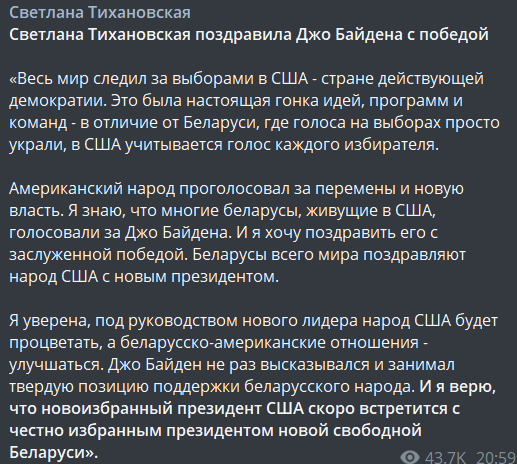 22:42 Не может быть. Байдена с победой поздравила Светлана Тихановская.