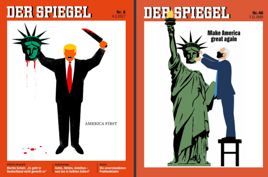 23:20 Немецкий журнал "Шпигель", который ранее изобразил Трампа, отрезавшего голову статуе Свободы, теперь показал Байдена, который возвращает ее назад.