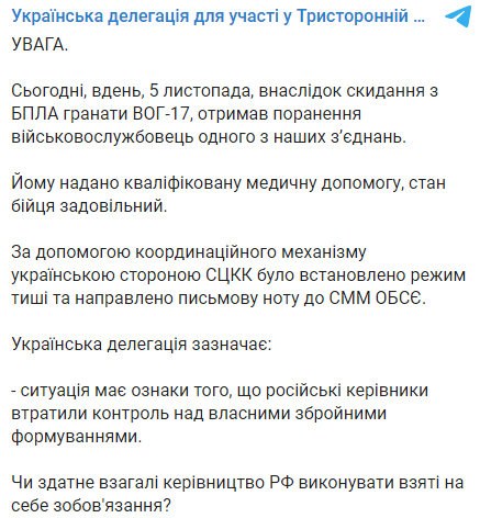 Сегодня, 5 ноября, на Донбассе, где согласовали 4 новые точки разведения сил, получил ранение украинский военный. Противник сбросил на украинские позиции гранату ВОГ-17 с беспилотника.
