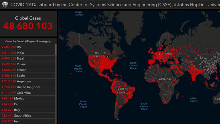 По данным на утро 6 ноября число зараженных на планете приближается к 49 миллионам, фото: arcgis.com