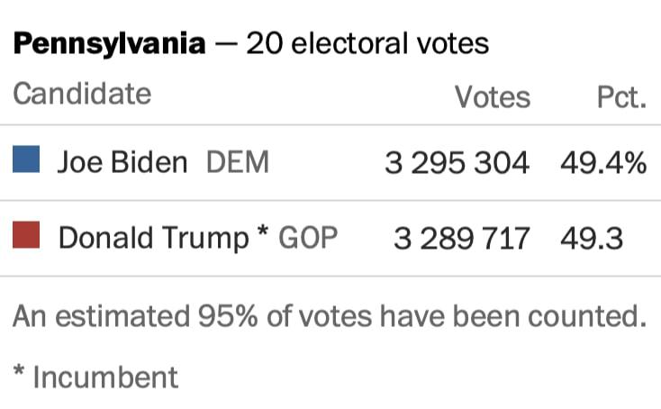 Напомним, в течение сегодняшнего дня в штате Пенсильвания исчезло 2% подсчитанных голосов, после того, как проблему устранили у обоих кандидатов изменилось количество голосов. После пересчета у Дональда Трампа добавилось 8 135 голосов избирателей, у кандидата от демократов Джо Байдена - плюс 36 576 голосов.