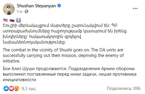 "Бои в окрестностях Шуши продолжаются. Подразделения Армии обороны успешно выполняют поставленные перед ними задачи, лишая противника инициативности", - написала Степанян в Фейсбуке.