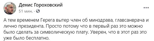 "А тем временем Герега вытер член о минздрав, главсанврача и лично президента. Просто потому что в первый раз это можно было сделать за символическую плату. Уверен, что в этот раз это уже было бесплатно", - написал блогер Денис Гороховский.