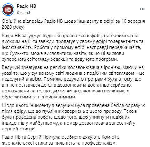 На радио заявили, что их ведущий отреагировал на антисемитизм "с иронией". Но признали, что Притула допустил ошибку и должен был отнестись серьезнее к словам звонившего. С ведущим "провели беседу", а номер звонившего занесли в "черный список".