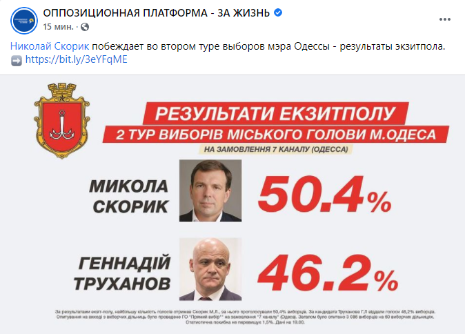 20:38 ОПЗЖ также заявляет о победе своего кандидата.