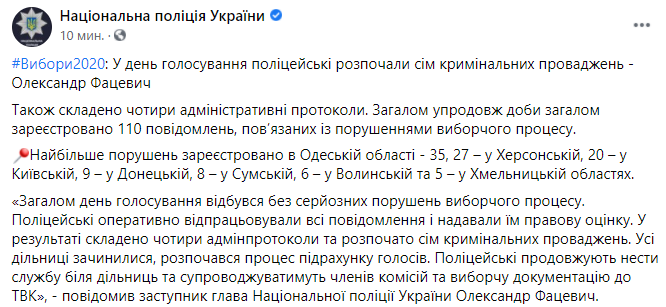 09:48 Как сообщил начальник Главного управления Нацполиции в Одесской области Олег Бех, 15 ноября полиция зарегистрировала 37 сообщений о нарушениях, связанных с избирательным процессом. Среди них - выдача бюллетеня на руки без паспорта, агитация в день выборов, ложная информация о заминировании одного участка, два участка открылись с опозданием.