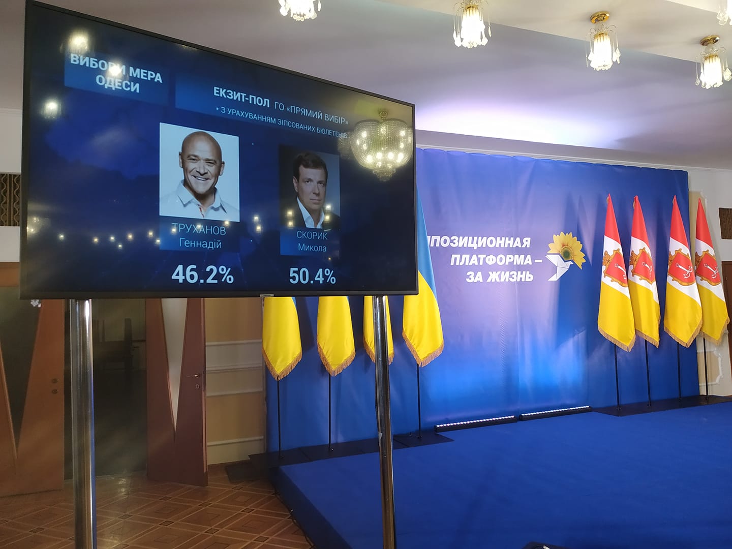 По данным экзитпола КМИС, побеждает действующий мэр Геннадий Труханов с 55,1%. У его соперника, кандидата от ОПЗЖ, Николая Скорика - 42,8%.