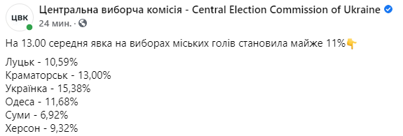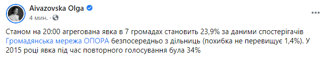 12:21 Глава правления Гражданской сети "ОПОРА" Ольга Айвазовская сообщила, что самая высокая явка была в Каменец-Подольском Хмельницкой области и Украинке Киевской области. Самая низкая явка зафиксирована в Сумах.