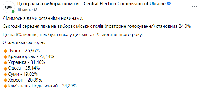22:15 Официальная явка по данным ЦИК. На участки пришли 24% избирателей. Это на 8% меньше, чем в первом туре. Меньше всего ходили на выборы в Сумах.