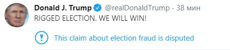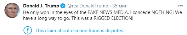 Президент США Дональд Трамп вскоре после поста о фальсификациях отказался признавать победу Джо Байдена на выборах. Об этом он написал в Twitter.