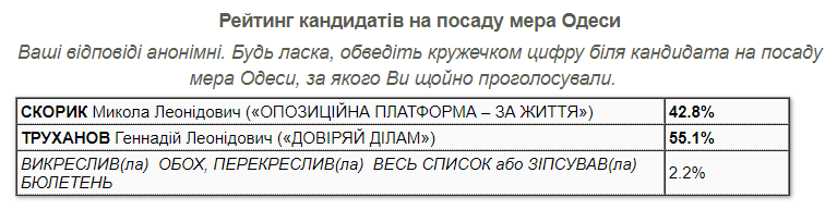 По данным экзитпола КМИС, побеждает действующий мэр Геннадий Труханов с 55,1%. У его соперника, кандидата от ОПЗЖ, Николая Скорика - 42,8%.
