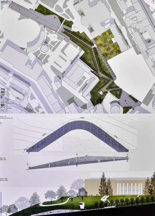 Проект должен был начинаться с Майдана. К нему можно попасть по мощениям Майдана, то есть планировалось единое плавно перетекающее пространство. В одном из склонов должна была располагаться ниша, в которой размещены 107 пилястр, каждая из которых посвящена одному из героев Небесной сотни.