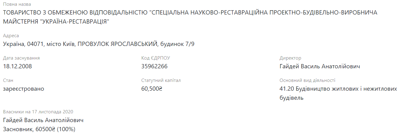 По информации "Страны", подрядчиком, на которого ушли деньги, стало ООО "Спеціальна наукова майстерня "Україна-реставрація" (его директор - Василий Гайдей). Это известное предприятие на данном рынке. Так, оно реконструировало здания Софии Киевской.
