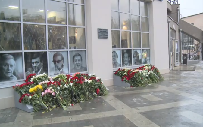 Как пишет "КоммерсантЪ", на входе в театр дежурят полицейские. Люди заходят в театр и поднимаются в главный зал, где звучит траурная музыка.