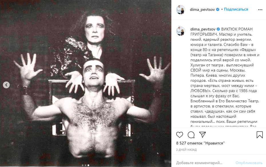 Многие артисты делятся своей скорбью в социальной сети. "Виктюк Роман Григорьевич. Мастер и учитель, гений, ядерный реактор энергии, юмора и таланта. Спасибо Вам - в конце 80-х на репетициях "Федры" (театр на Таганке) поверили в меня и поделились этой верой со мной. Хулиган от театра, выплеснувший свой мир на сцены, Москвы, Питера, Киева, многих других городов. "Есть страна живых, есть страна мертвых, мост между ними - любовь!". Сколько раз с 1986 года слышал я эту фразу от Вас. Влюбленный в Его Величество Театр, в артистов, в спектакли, которые ставил, "дедушка", как он сам себя называл, был настоящий гениальный... псих. Ваши репетиции были отдельными спектаклями, Вас пародировали влюбленные в Вас артисты еще долго, после премьеры, поставленного Вами спектакля... А сколько актерских имен вы открыли, я - в их числе. Спасибо, Мастер, Учитель, царствие вам Небесное", - написал Дмитрий Певцов.