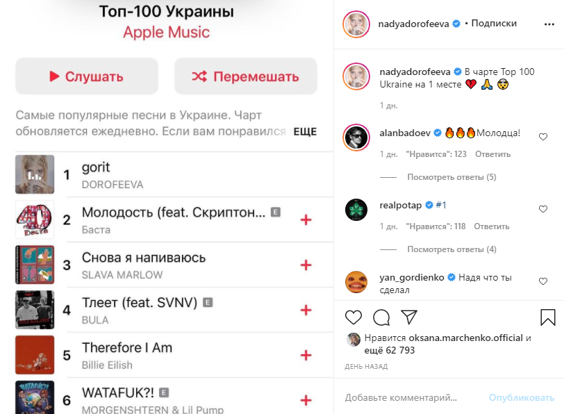 Этот факт не остановил фанатов музыки, которые в Apple Music просто заслушали песню Дорофеевой - она опередила известные среди молодежи "Снова я напиваюсь" Славы Марлоу и "Watafuk?!" Моргенштерна с Lil Pump.