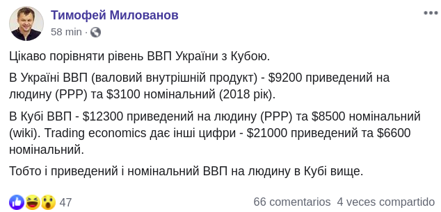 Также Милованов говорил, что Украина беднее коммунистической Кубы, которая под санкциями США и не имеет полезных ископаемых.