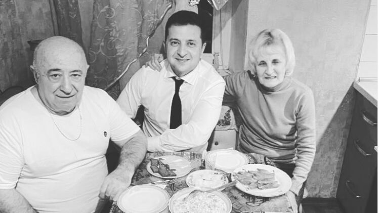 На снимке Зеленский сидит на тесной кухне вместе с Риммой Владимировной и Александром Семеновичем. Перед ними на столе стоят блюда с незамысловатой едой: салатом, сырной нарезкой, квашеной капустой и жареными куриными окороками. Также присутствуют стопки для спиртного, хотя бутылки не видно.