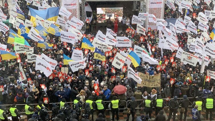 Участники акции протеста ФОПов, которая продолжается под стенами Рады с утра вторника, 1 декабря, не стали прерывать митинг после того, как парламент отсрочил введение кассовых аппаратов для части предпринимателей до 2022 года.