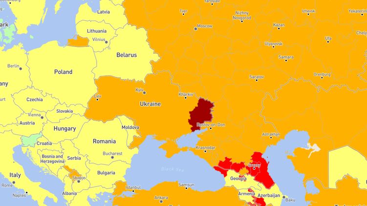 Донецкая и Луганская области, отмечены на карте, как самые экстремальные направления для посещения. Остальную часть страны отнесли к зоне среднего риска.