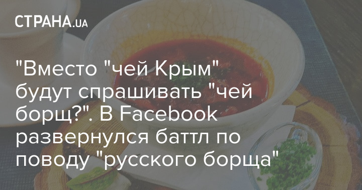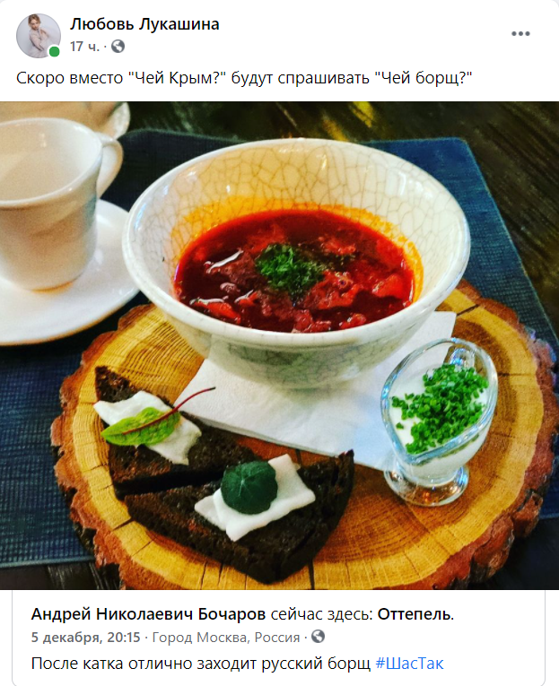 "Скоро вместо "Чей Крым?" нужно будет спрашивать "Чей борщ", - иронизирует украинский юрист Любовь Лукашина на своей странице в ФБ.