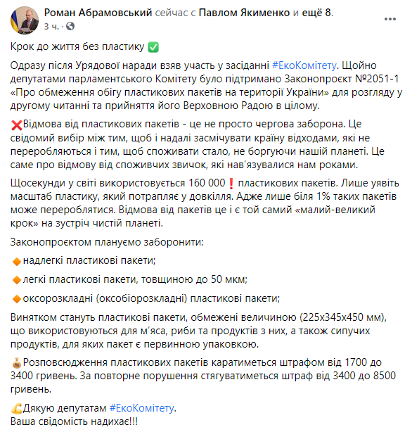 "Только что депутаты парламентского комитета поддержали законопроект №2051-1 "Об ограничении оборота пластиковых пакетов" для рассмотрения во втором чтении и принятия его Верховной радой в целом", - написал министр.
