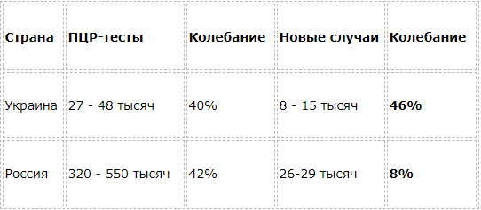 В Украине колебания тестов и заболевших за одни сутки одинаковое - в районе 40%. В России же ПЦР-исследования "скачут" на те же 40%, а число заболевших за тот же период поменялось только на 8%.