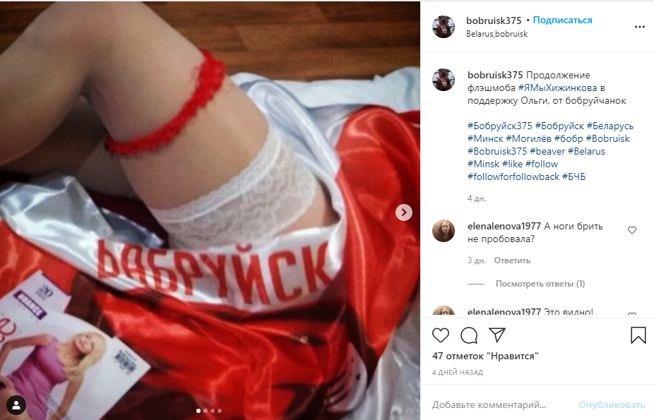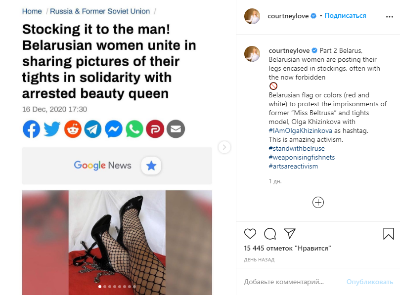 В свою очередь, американская певица Кортни Лав восхитилась флешмобом белорусских девушек в поддержку Ольги Хижинковой. Лав объяснила подписчикам, что женщины массово демонстрируют в соцсетях ноги в чулках в солидарность с моделью, задержанной на акции протеста в Минске в начале ноября. "Это удивительный активизм", - заявила звезда.