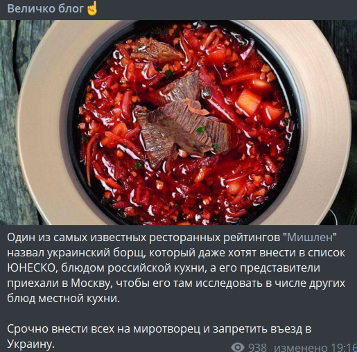 А вчера посольство нашей страны во Франции добралось до ресторанных экспертов от Michelin. Они на днях совершили тяжкий в глазах МИД Украины проступок: назвали борщ русским блюдом.