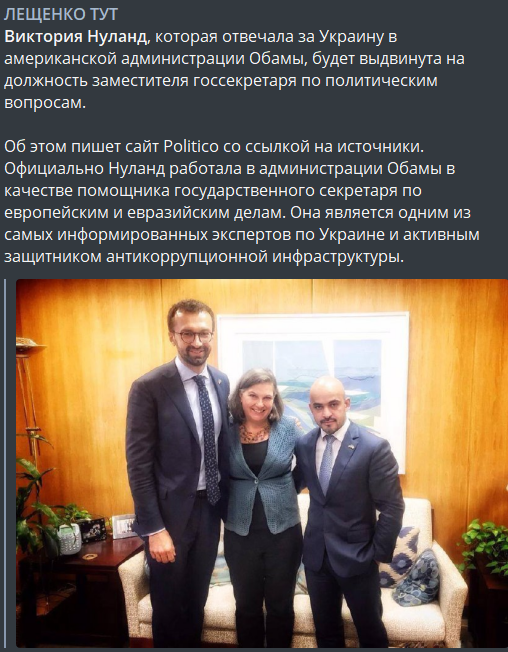 То есть возвращение Нуланд в Госдепартамент может означать и новые переговоры с Россией. Которые, напомним, она уже вела без участия Украины, напрямую с представителями Путина. И этот сценарий может снова реализоваться.