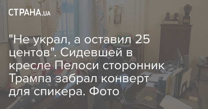 "Не украл, а оставил 25 центов". Сидевшей в кресле Пелоси сторонник Трампа забрал конверт для спикера. Фото