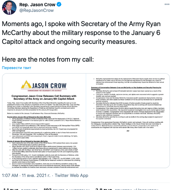 В США говорят об угрозе большой бойни. В частности, о готовящемся восстании 20 января предупредил министр армии США Райан Маккарти в разговоре с членом Палаты представителей Джейсон Кроу, о котором тот рассказал в своем Twitter
