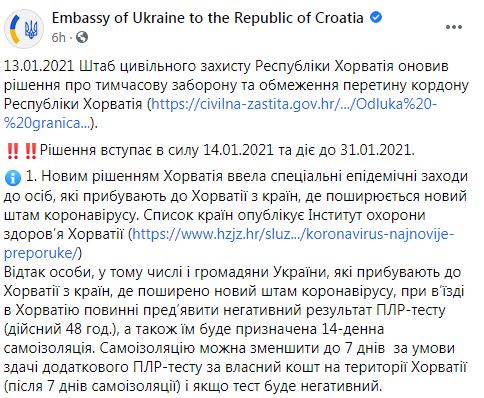 "Лица, в том числе и граждане Украины, которые прибывают в Хорватию из стран, где распространен новый штамм коронавируса, при въезде в Хорватию должны предъявить отрицательный результат ПЦР-теста (действительный 48 часов), а также им будет назначена 14-дневная самоизоляция. Самоизоляцию можно уменьшить до 7 дней при условии сдачи дополнительного ПЦР-теста за собственный счет на территории Хорватии (после 7 дней самоизоляции) и если тест будет отрицательный", - указывается в сообщении.