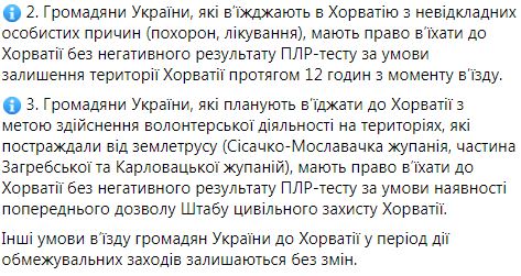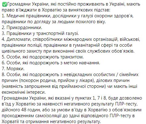 Другие условия въезда граждан Украины в Хорватию в период действия ограничительных мер остаются без изменений.