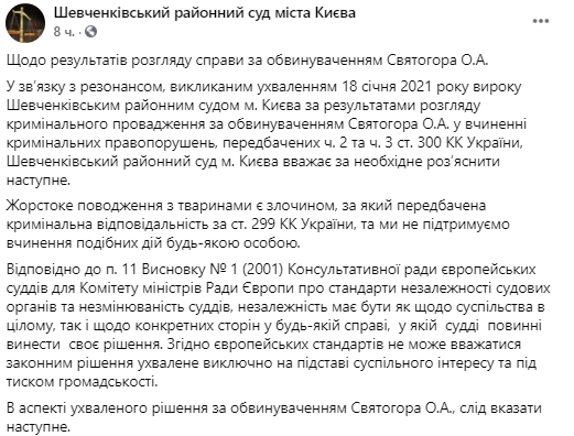 В заявлении сказано, что в Украине за жестокое обращение с животными предусмотрена уголовная ответственность по ст. 299 Уголовного кодекса (УК). Тем не менее в ситуации со Святогором есть некоторые нюансы.