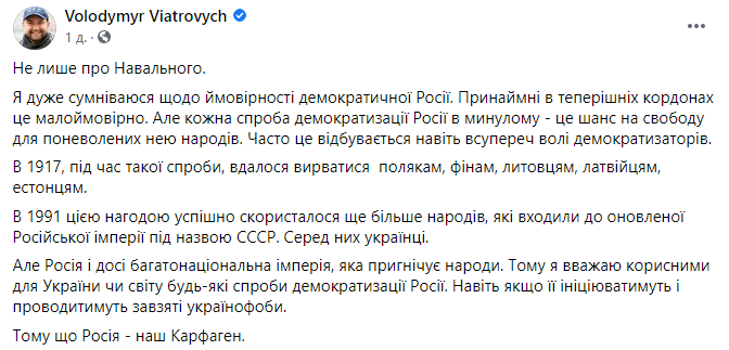 В 1991 по случаю успешно воспользовались еще больше народов, входивших в обновленную Российскую империю под названием СССР. Среди них украинцы. Но Россия до сих пор многонациональная империя, которая подавляет народы. Поэтому я считаю полезными для Украины или мира любые попытки демократизации России", - написал нардеп от "Европейской солидарности" Владимир Вятрович.