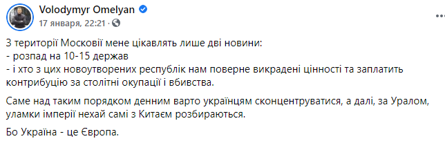 Именно над такой повесткой дня стоит украинцам сконцентрироваться, а дальше, за Уралом, обломки империи пусть сами с Китаем разбираются. Потому что Украина - это Европа", - написал экс-министр транспорта Владимир Омелян.